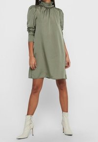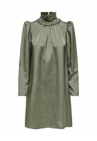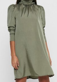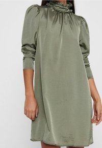 Robe en satin vert olive avec un col à volants haut, des manches bouffantes aux épaules et une coupe fluide, présentant un ourlet légèrement courbé.