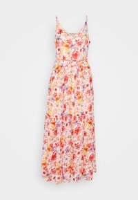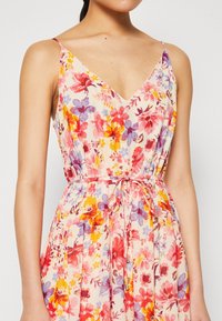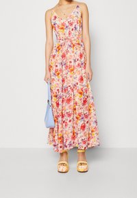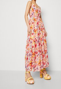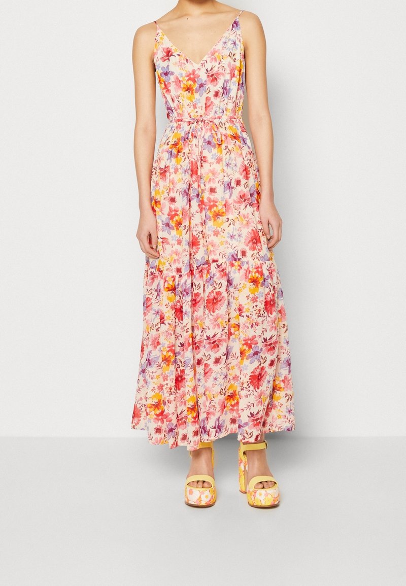 Robe longue fleurie aux teintes rose, jaune et violette. Elle présente un col en V, des bretelles réglables et une jupe à volants. Associée à des sandales à talons jaunes.