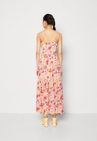 Robe maxi fleurie rose, à corsage smocké, encolure carrée et bretelles épaisses, avec une jupe à volants et des sandales noires.