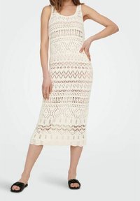 Robe sans manches tricotée en blanc cassé avec des motifs en losanges et en zigzags complexes. Longueur midi avec un ourlet festonné, présentant une finition texturée.