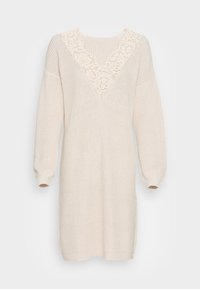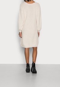 Robe pull en tricot beige avec une coupe fluide, un relief texturé et un motif ajouré. Manches longues avec des poignets ajustés et encolure ronde.