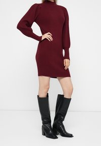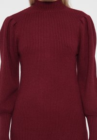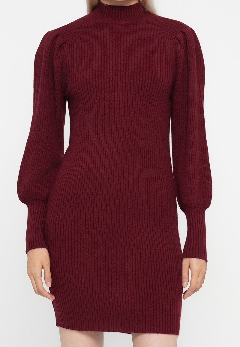 Femme portant une robe-pull ajustée en maille côtelée bordeaux avec des manches longues bouffantes et un col montant, sur un fond uni.