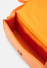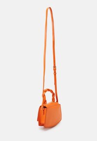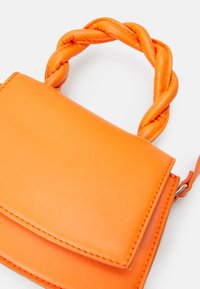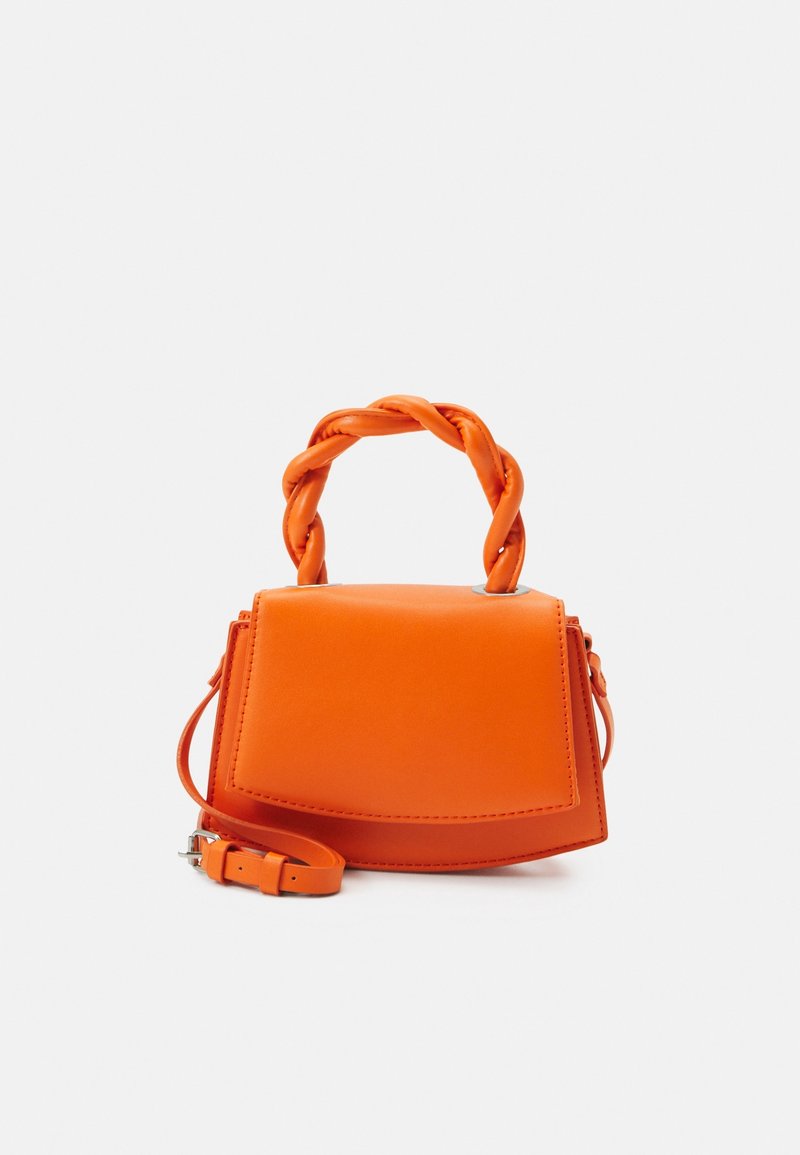 Sac à main en cuir orange avec une poignée tressée, forme rectangulaire et bandoulière amovible. Texture lisse avec des accents de coutures visibles.