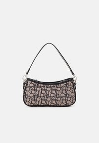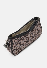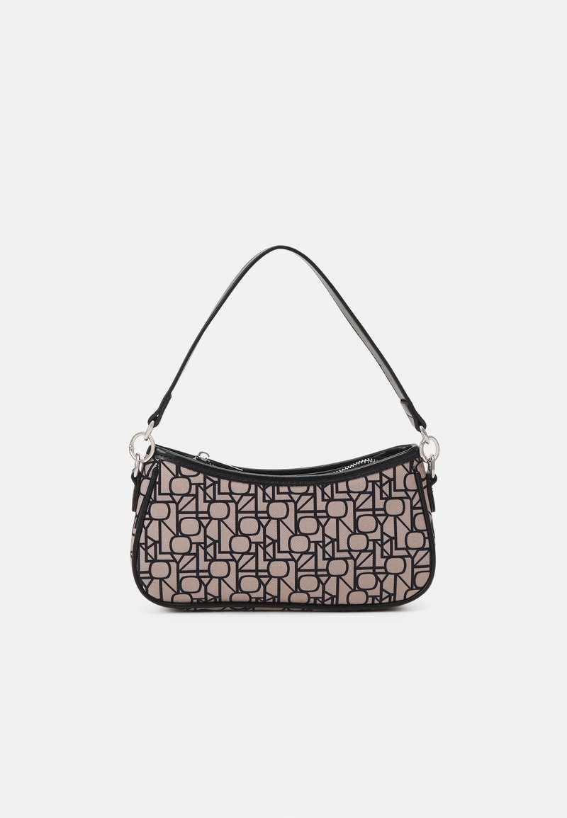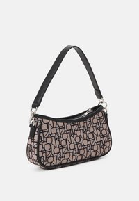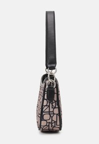 Sac hobo avec un imprimé géométrique comprenant un tissu rose avec des contours noirs, forme arrondie, fermeture éclair et une bandoulière noire.
