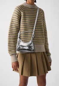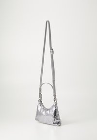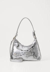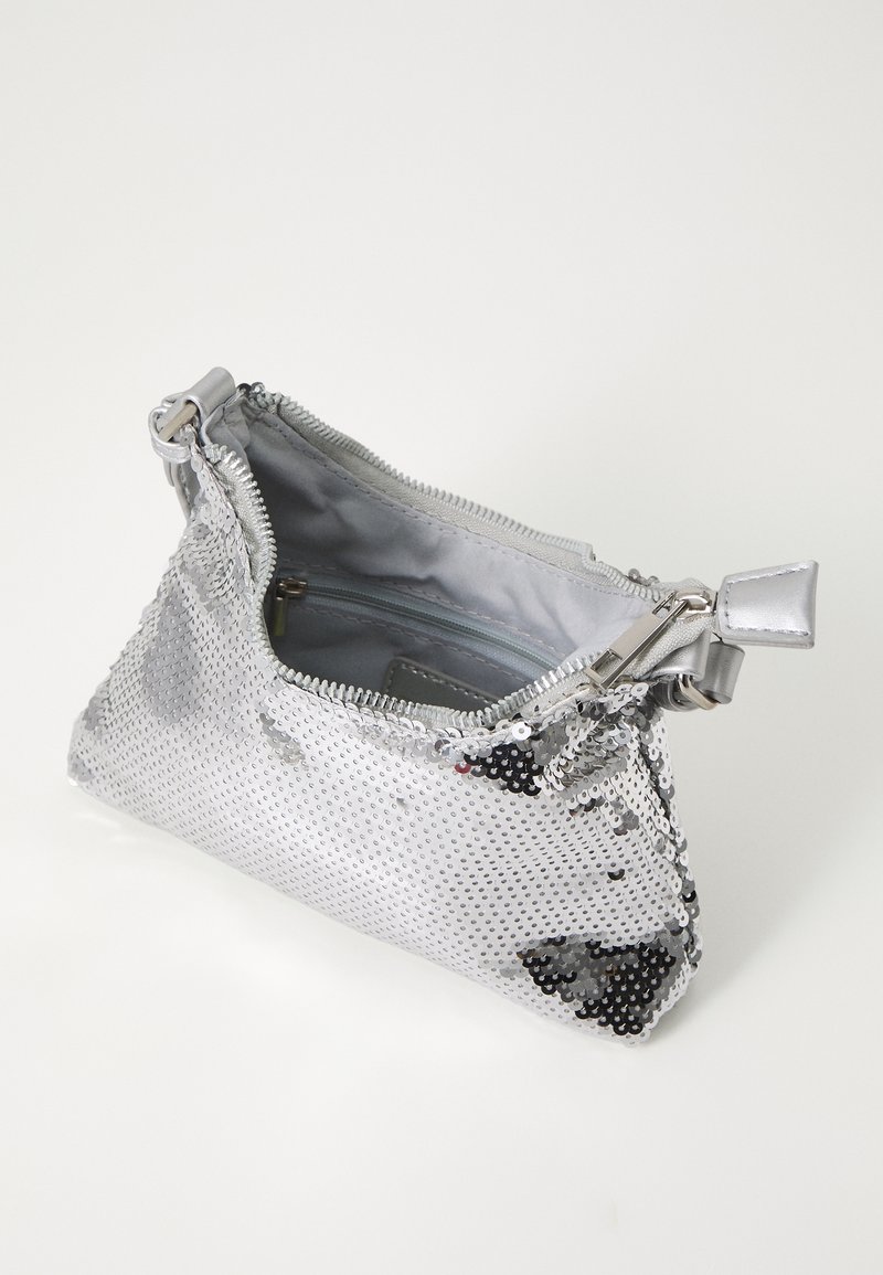 Pochette en sequins argentés avec fermeture éclair et ferrures métalliques. Forme légèrement effilée, doublure intérieure lisse et design minimaliste.