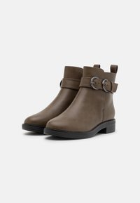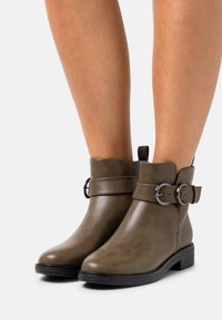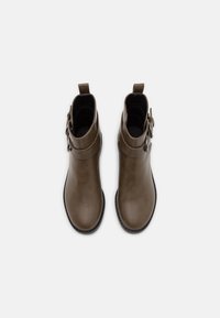 Bottines vert olive en cuir lisse, dotées d'une bride latérale avec boucle, d'un bout arrondi et d'un petit talon carré.