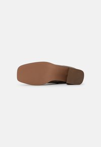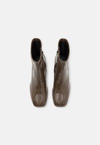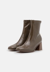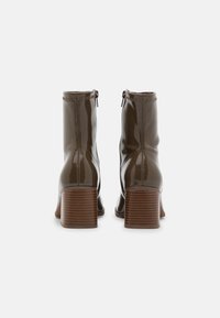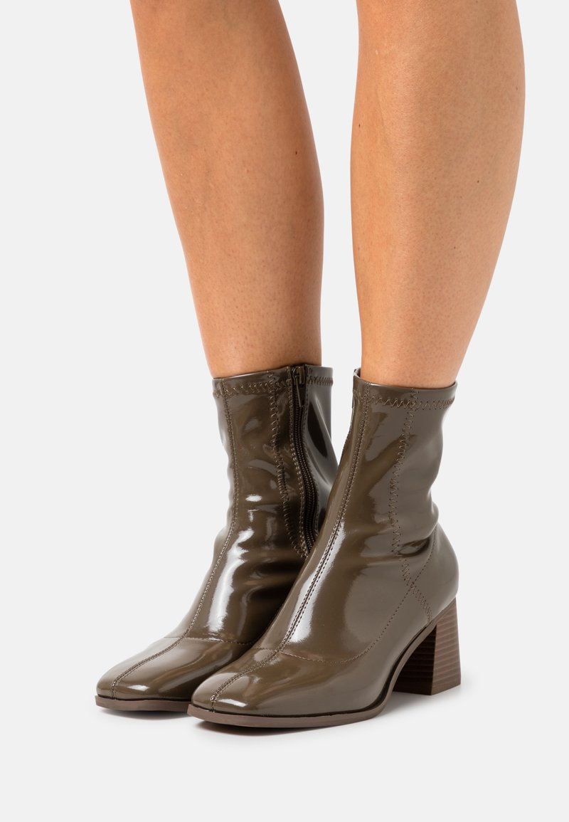 Bottines en cuir verni vert olive avec un bout carré et des détails cousus, dotées d'une fermeture éclair latérale et d'un talon en bois empilé.