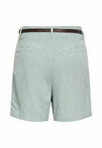 Femme portant un short taille haute vert clair avec des plis, une ceinture noire, un haut sans manches beige et des ballerines à bride arrière tissées beiges, debout devant un fond blanc.