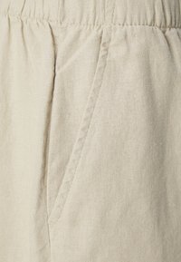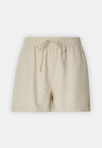 Shorts légers beiges avec une taille élastique et un cordon de serrage. Dispose de poches latérales et d'une coupe décontractée. Portés avec des tongs noires.