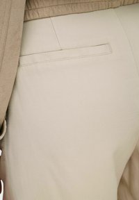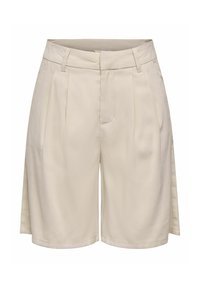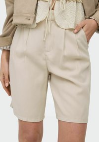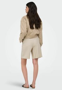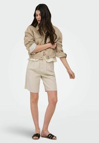 Femme portant un short beige taille haute longueur genou, un top court crème, une veste beige et des sandales noires à enfiler, debout les mains le long du corps.
