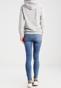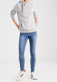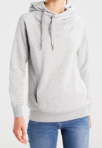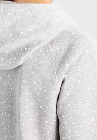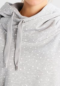 Sweat-shirt gris clair à col châle, à pois blancs, avec poignets côtelés. Tissu doux avec une coupe décontractée et poches latérales.