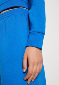 Femme portant un sweat-shirt court bleu vif à manches longues et un pantalon assorti taille haute avec taille élastique.