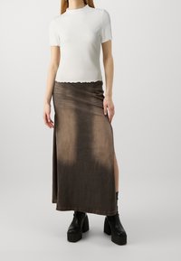 Femme portant un haut ajusté à manches courtes blanches côtelées avec un ourlet à bord ondulé et une jupe dégradée marron sur un fond uni.