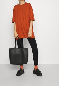 Personne portant un pantalon noir slim, des chaussettes orange pailletées, des mocassins noirs épais et un haut orange à manches courtes, debout devant un fond uni.