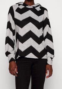 Haut à manches longues noir et gris à motif chevron avec une capuche, tissu texturé et poignets élastiqués. Associé à un pantalon noir.