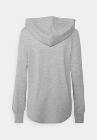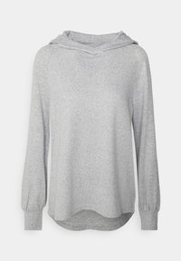 Pull à capuche gris clair en maille, avec des manches longues bouffantes et un ourlet légèrement incurvé.