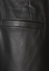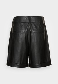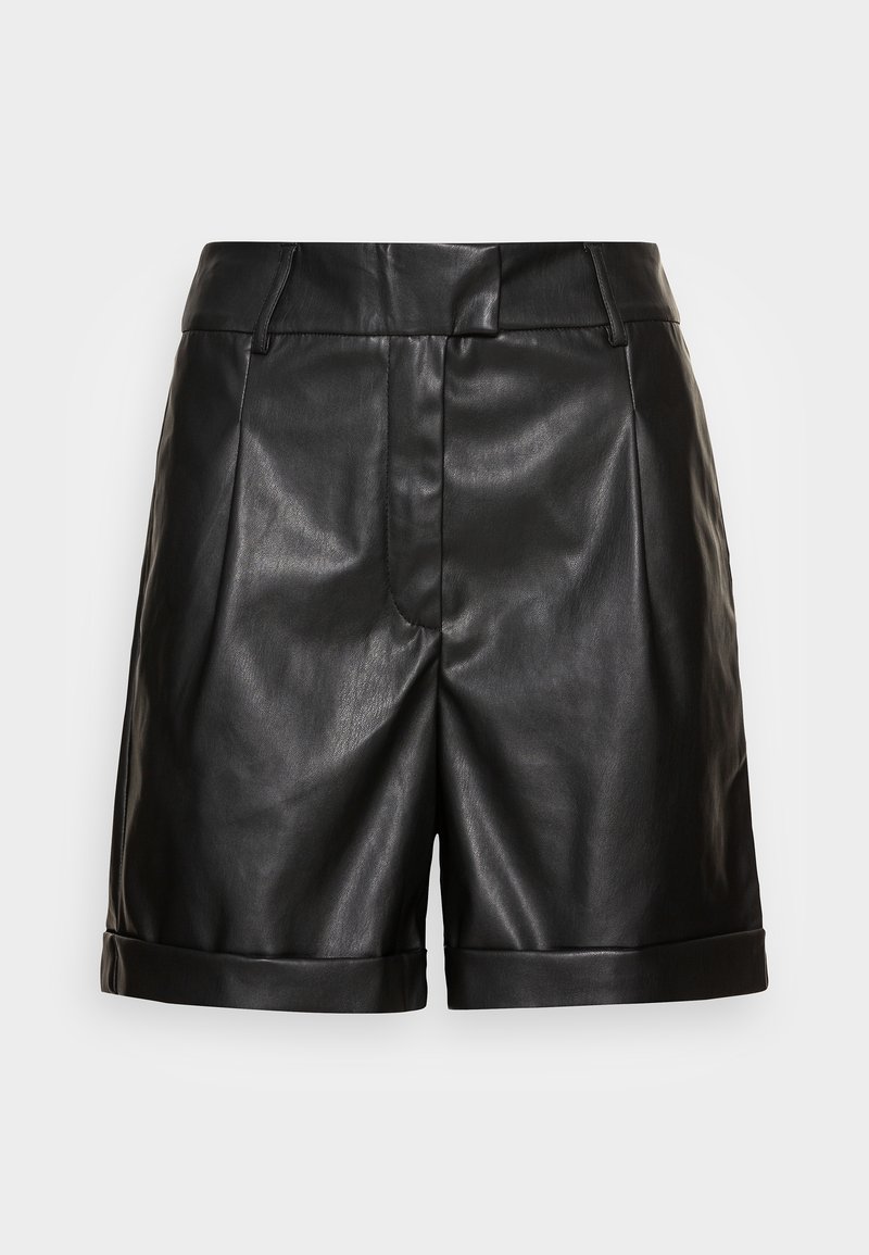 Shorts ajustés en similicuir noir avec ourlets retournés et passants de ceinture, présentés sur un fond clair uni.
