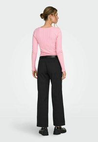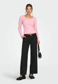 Pantalon noir à jambes larges avec une texture lisse, doté d'une ceinture et de poches latérales. Associé à un haut à manches longues côtelé rose et des chaussures noires.