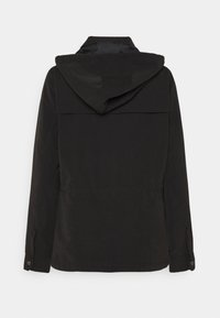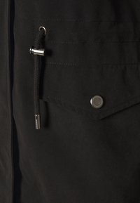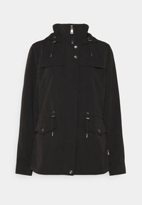 Veste noire à capuche avec fermeture éclair frontale, boutons-pression, cordons de serrage réglables à la capuche et à la taille, et deux rabats de poches à boutons-pression.