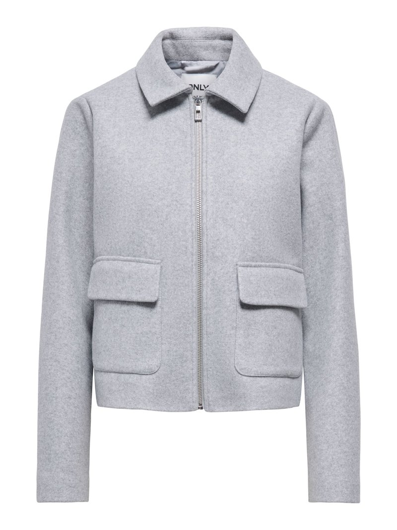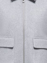 Veste en laine gris clair avec une fermeture éclair frontale, un large col et deux grandes poches à rabat sur le devant.