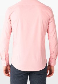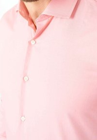 Homme portant une chemise à manches longues boutonnée de couleur rose clair, associée à un pantalon texturé foncé, debout devant un fond uni.