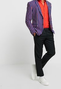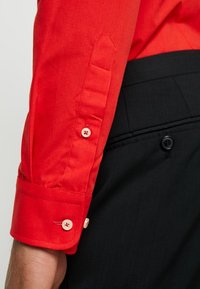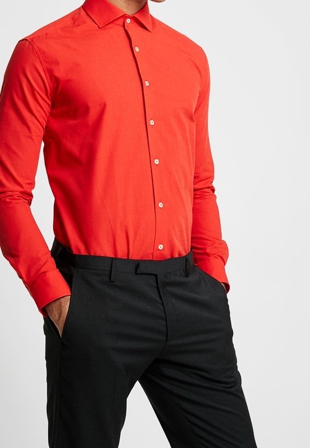 Homme portant une chemise à manches longues ajustée de couleur rouge vif, boutonnée, rentrée dans un pantalon de costume noir, les mains dans les poches.