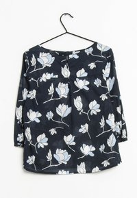 Chemisier bleu marine avec motif floral blanc et bleu clair, encolure ronde, manches trois-quarts et tissu léger texturé.