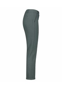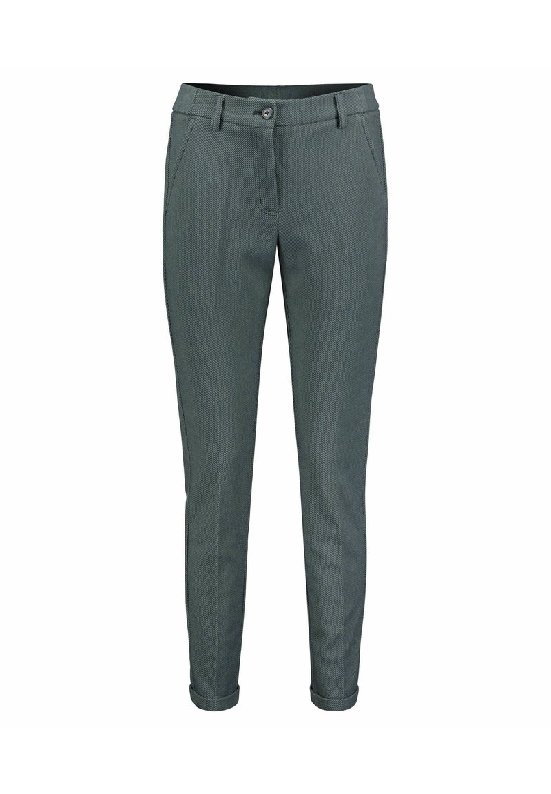 Pantalon à coupe ajustée gris foncé texturé avec poches avant, passants pour ceinture, fermeture par bouton et ourlets retroussés.