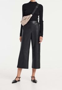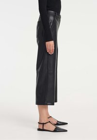 Femme portant un pantalon en cuir noir large et raccourci, un haut noir à manches longues et ajusté, ainsi que des chaussures plates noires à bride T pointues.