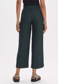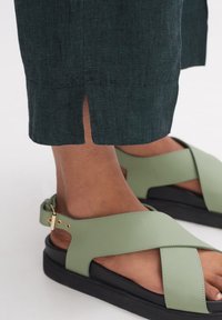 Pantalon large en lin vert foncé avec une taille à cordon et des poches latérales. Porté avec des sandales vertes à brides croisées sur un fond clair.