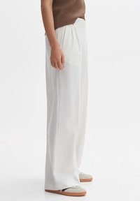Pantalons larges blancs sur mesure avec une texture lisse, des plis avant et une fermeture par un bouton unique à la taille. Associés à des chaussures de couleur neutre.
