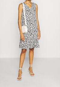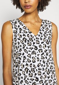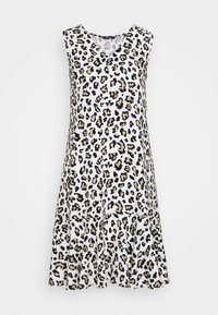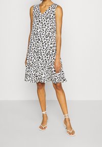 Femme portant une robe blanche sans manches, arrivant au genou, avec un imprimé léopard noir et beige, et des sandales à talons blancs avec des lanières.