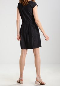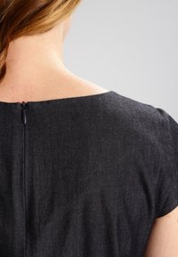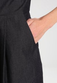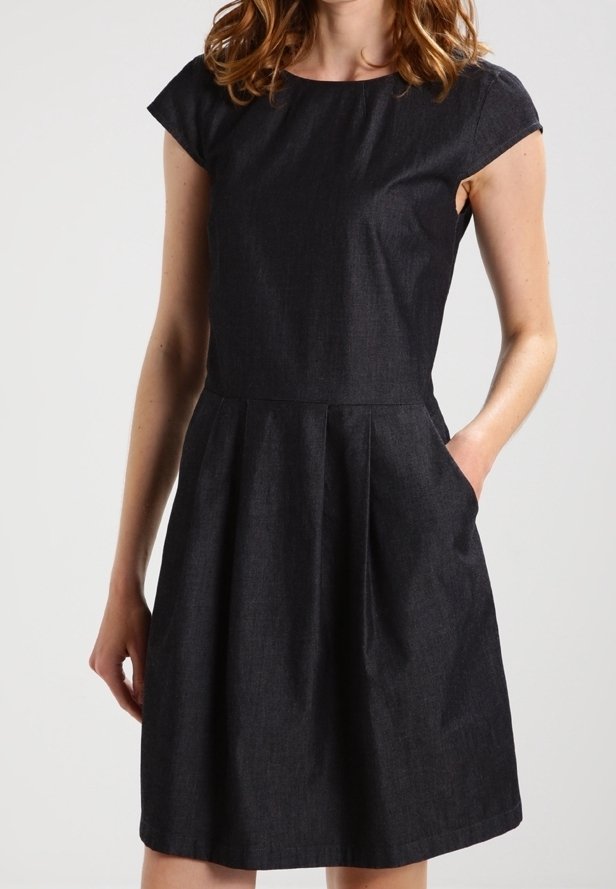 Robe en denim noir à manches courtes avec un corsage ajusté, une jupe évasée, des poches latérales et un col épuré, mettant en valeur une texture lisse.