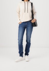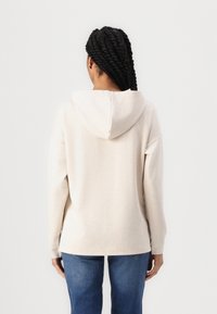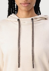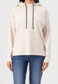 Femme portant un sweat à capuche beige avec des cordons foncés et un jean bleu, debout devant un fond clair uni.