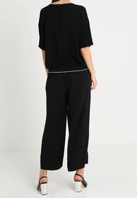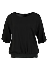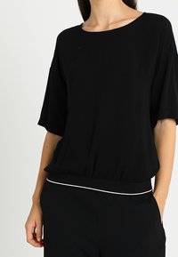 Haut noir à manches courtes avec une coupe ample, un col rond et une ceinture élastique comportant une bande accent blanche. Texture de tissu douce.
