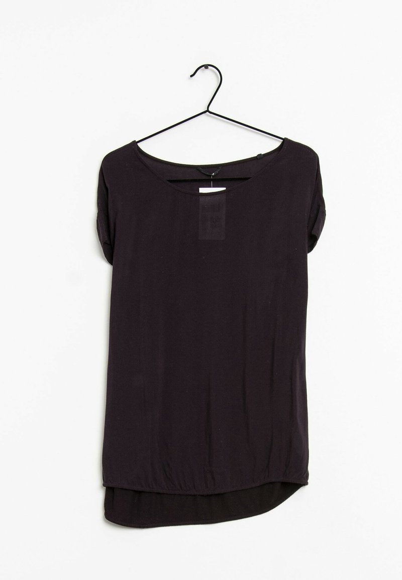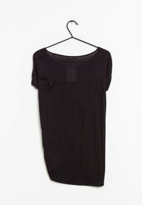 Blouse noire à manches courtes avec encolure ronde et dos légèrement plus long, suspendue à un cintre métallique noir sur fond blanc.