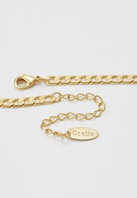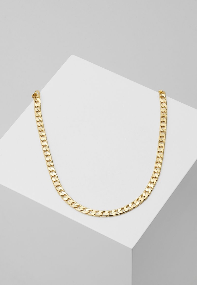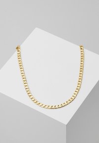 Collier chaîne en or avec maillons larges présenté sur une surface blanche anguleuse contre un fond gris clair.