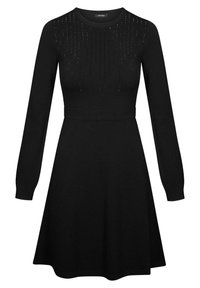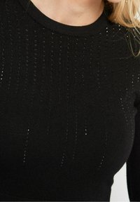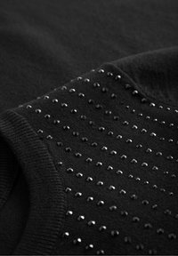Robe noire à manches longues avec un corsage ajusté et une jupe évasée. Présence d'embellissements en perles étincelantes sur le devant supérieur. Texture lisse.