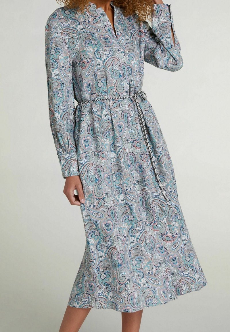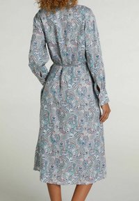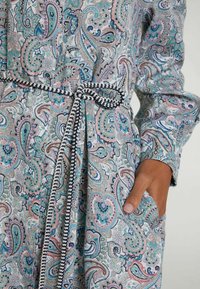 Femme portant une robe à manches longues ceinturée avec un motif paisley dans des tons de bleu, vert et violet, debout devant un fond uni.