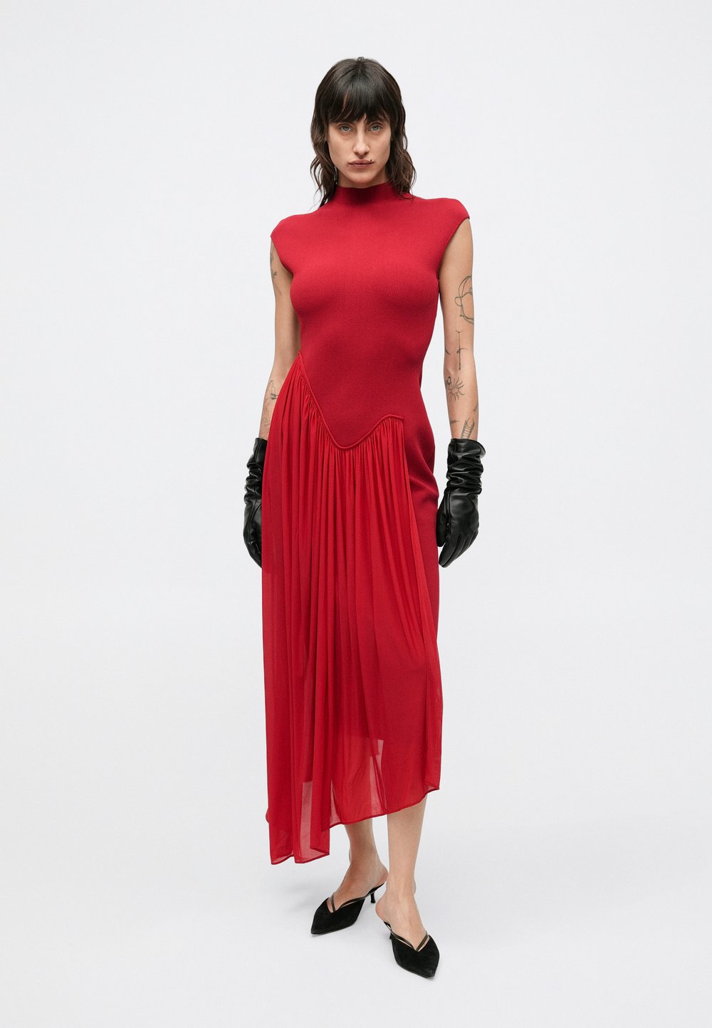 Robe longue violette avec un col haut, détail décolleté découpé et fente jusqu'à la cuisse. Portée avec des lunettes de soleil noires et des bottes montantes. Texture lisse.