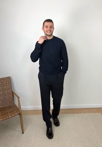 • Homme souriant en pull noir et pantalon, debout sur un tapis à côté d'une chaise en bois tressé, devant un mur blanc uni.