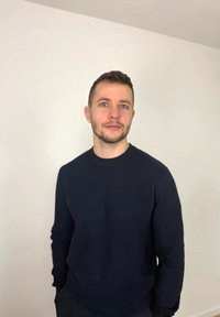 • Homme aux cheveux courts et à la légère barbe, portant un pull sombre, debout contre un mur clair uni, les mains dans les poches.