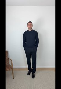 Homme portant un pull et un pantalon gris foncé, debout les mains dans les poches sur un tapis beige près d'une chaise tissée contre un mur blanc uni.