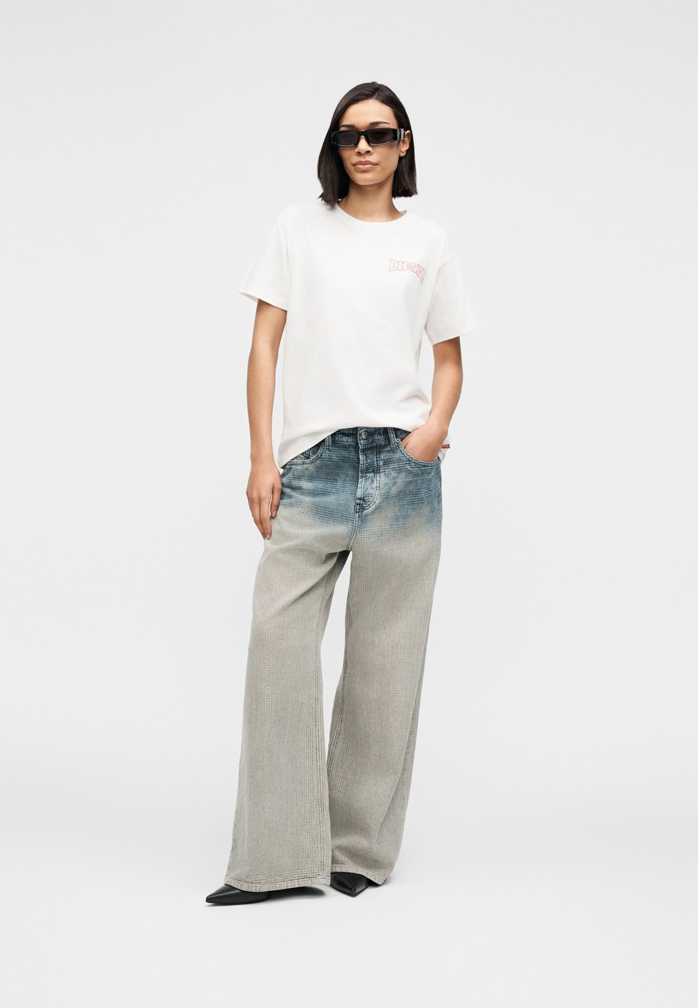 Pull en maille crème surdimensionné, détail en dentelle légère, associé à un jean bleu délavé ample. Sac cabas noir, sandales roses, cadre intérieur.