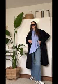 • Femme portant un manteau noir, un chemisier bleu avec un nœud, un jean large et des baskets, debout à côté d'une grande plante en pot dans une pièce moderne.