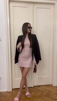 • Femme portant une robe côtelée rose aux manches évasées, un blazer noir posé sur les épaules, tenant un sac à main bordeaux avec une fermeture dorée.