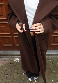 • Personne portant un long manteau marron, un haut blanc, un pantalon noir et des chaussures noires et blanches à motifs, tenant un téléphone et montrant des mains avec des bagues et des tatouages.