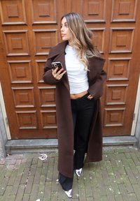 • Jeune femme portant un long manteau marron, un haut blanc froncé, un pantalon noir et des chaussures blanches à motifs, tenant un téléphone, debout devant des portes en bois.