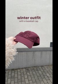 • Jeune femme portant un manteau beige duveteux et une casquette bordeaux, tenant un sac à main bordeaux assorti, devant un mur carrelé.
