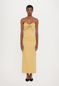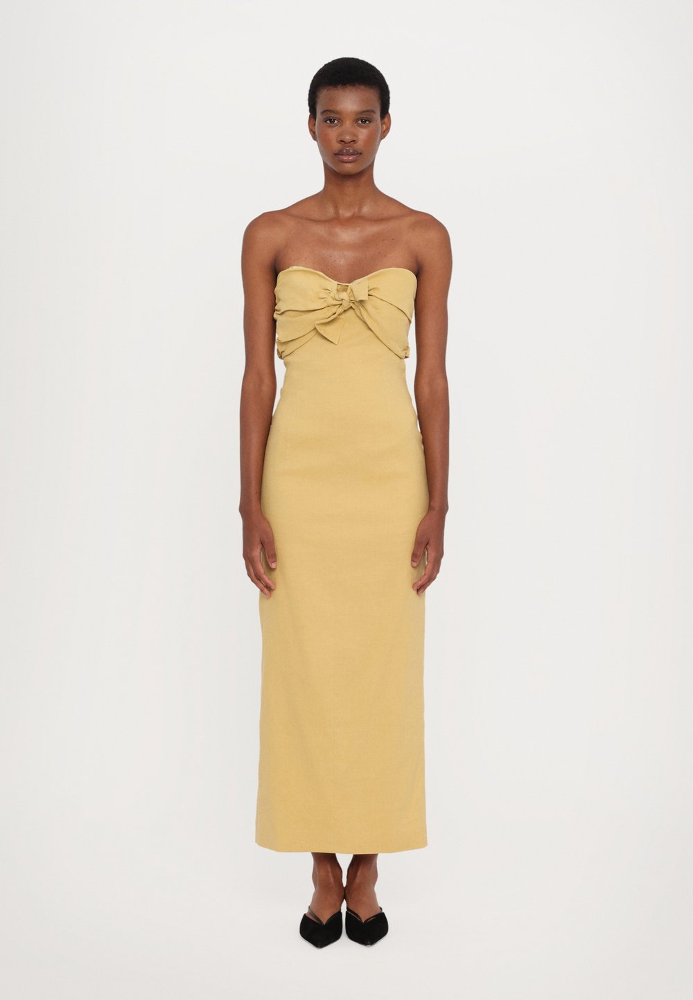 Robe jaune sans bretelles avec un drapé sur le côté, fabriquée en tissu lisse. Des rideaux blancs encadrent la scène, avec des chaises noires visibles derrière.